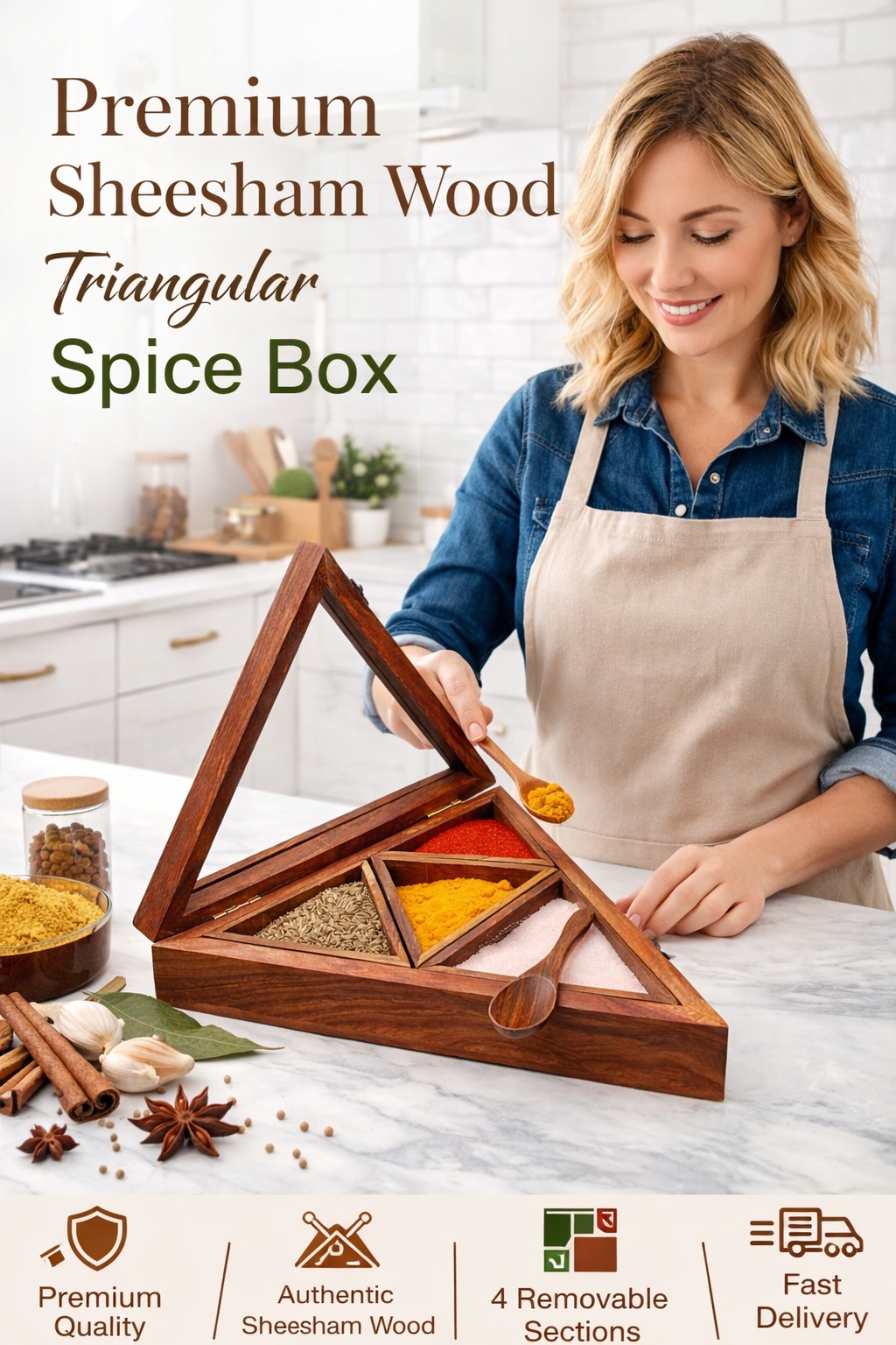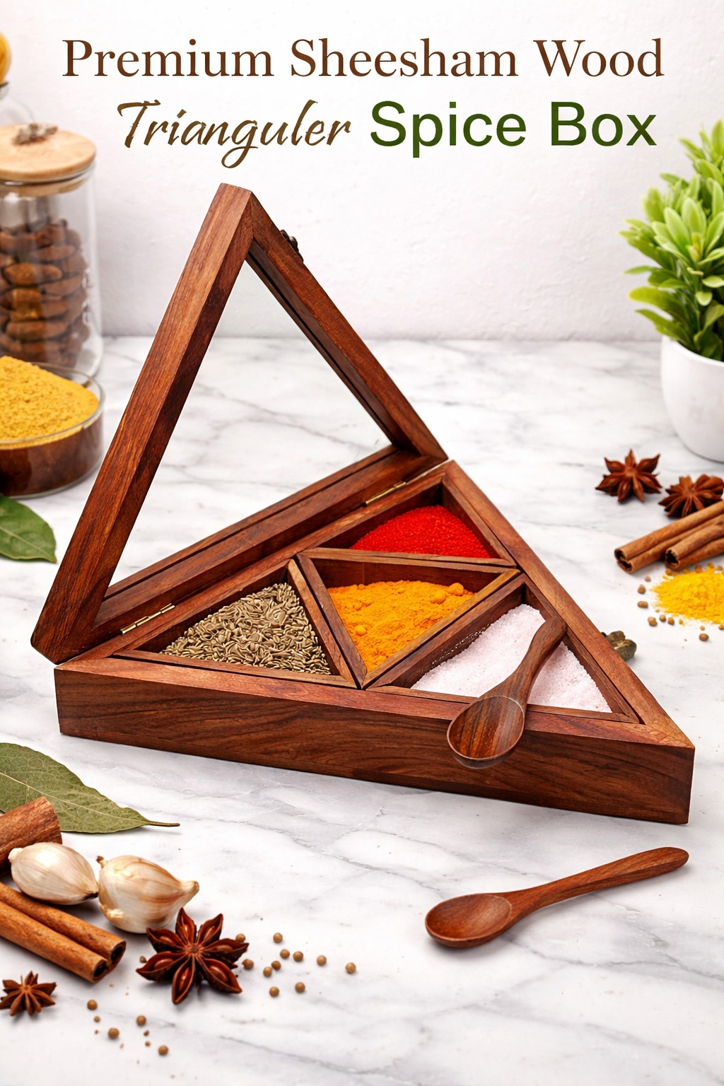 🔺 Wooden Spice Box Triangle – Handcrafted Premium Masala Box